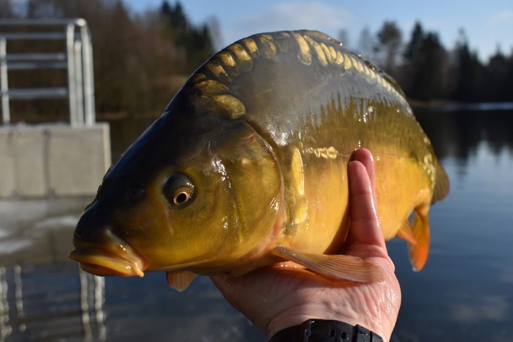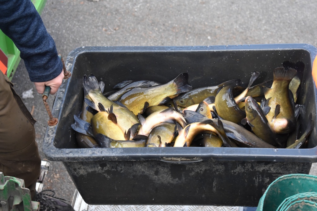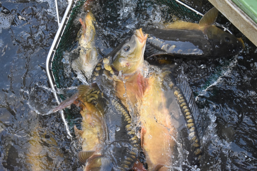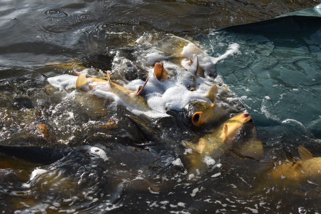 Dnes bylo distribuováno dalších 3200 kg kapra o průměrné váze 2kg/ks a 700 kg amura amura o průměrné váze 2,5 kg/ks.