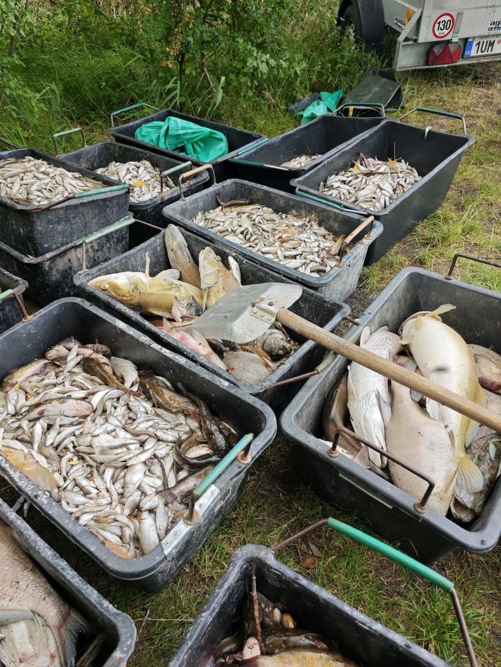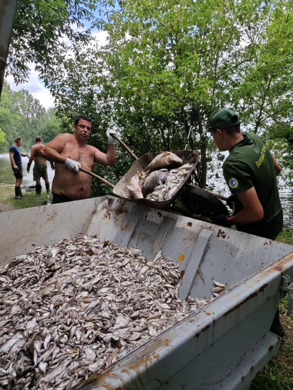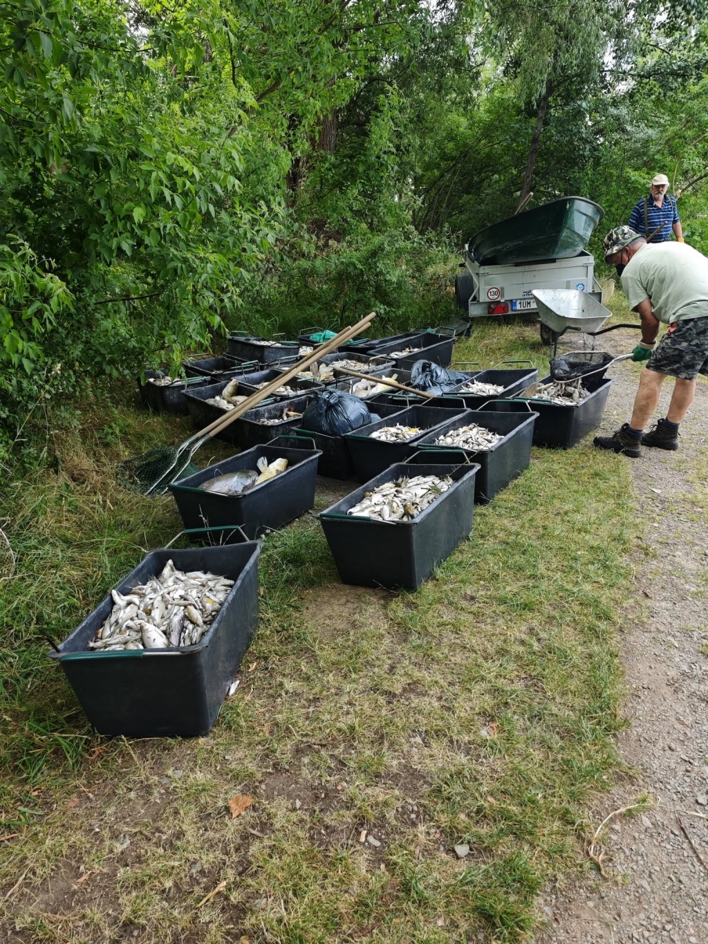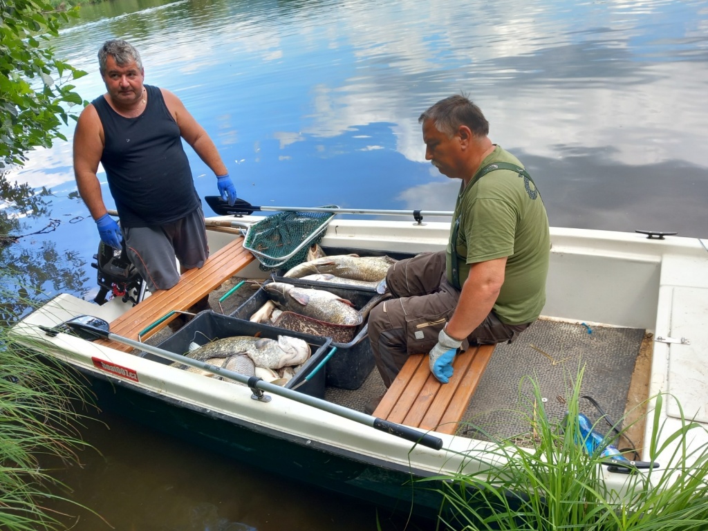 Na úklidových pracích se podílelo kolem 30 dobrovolníků z řad členů MO Teplice, ale i sousedních MO, přidalo se i několik místních a dětí z rybářských kroužků s maminkami. Všem, kteří přiložili ruku k dílu velice děkujeme. Práce to je velice náročná nejen s ohledem na současné tropické teploty, ale samozřejmě i čichové vjemy a smutek nad ztrátou těchto ryb. Odklizení padlých ryb bude probíhat i v dalších dnech.