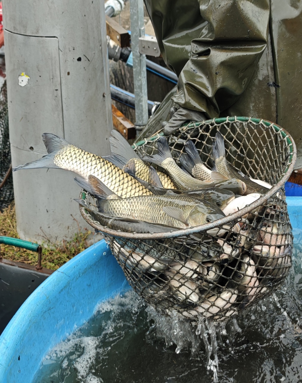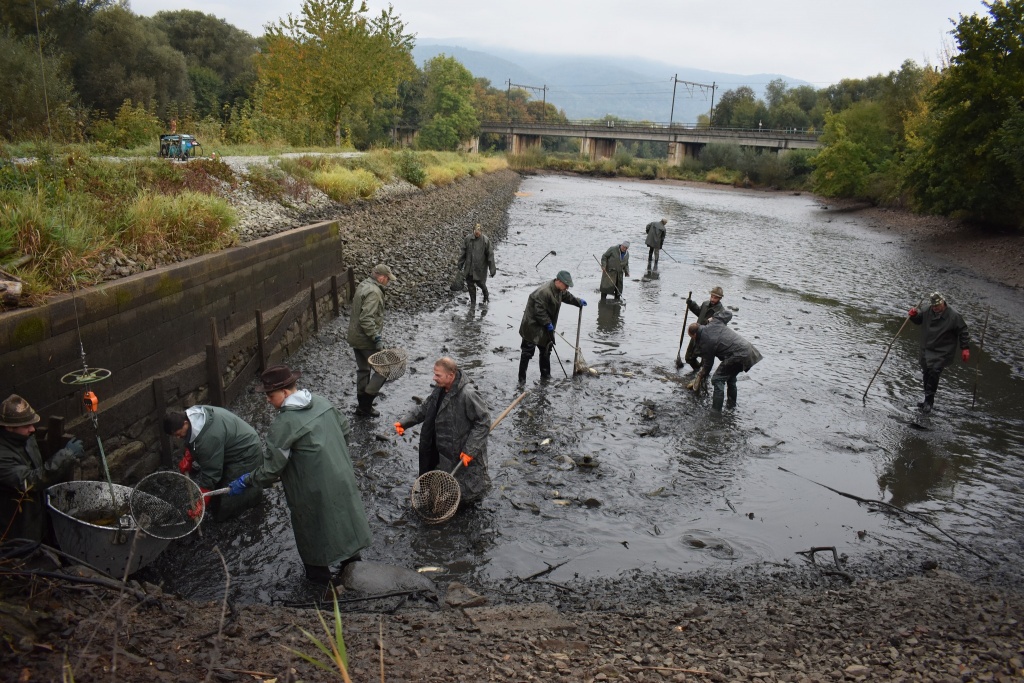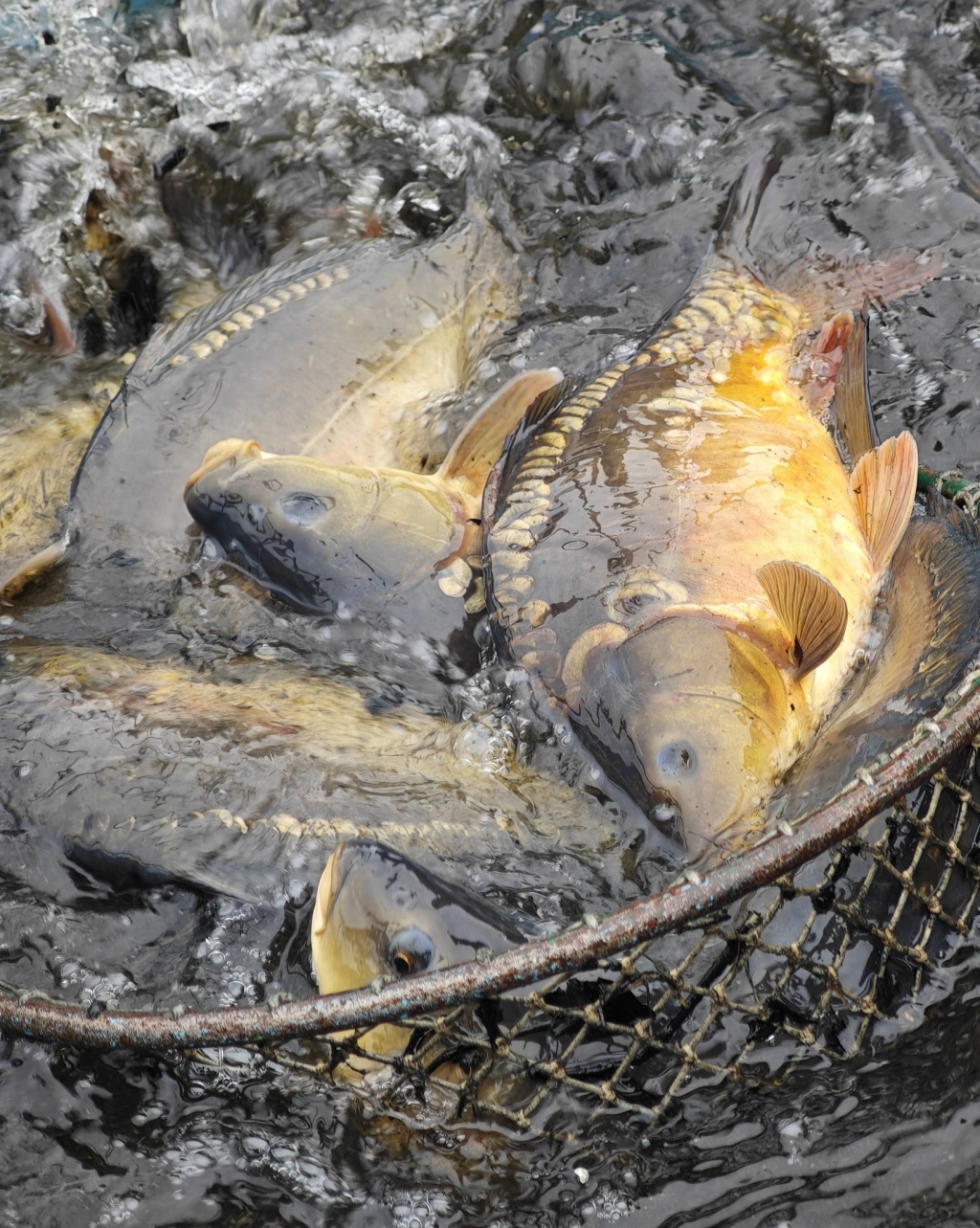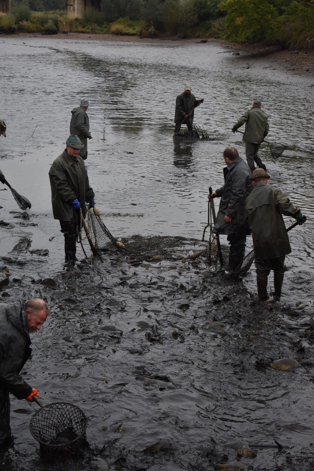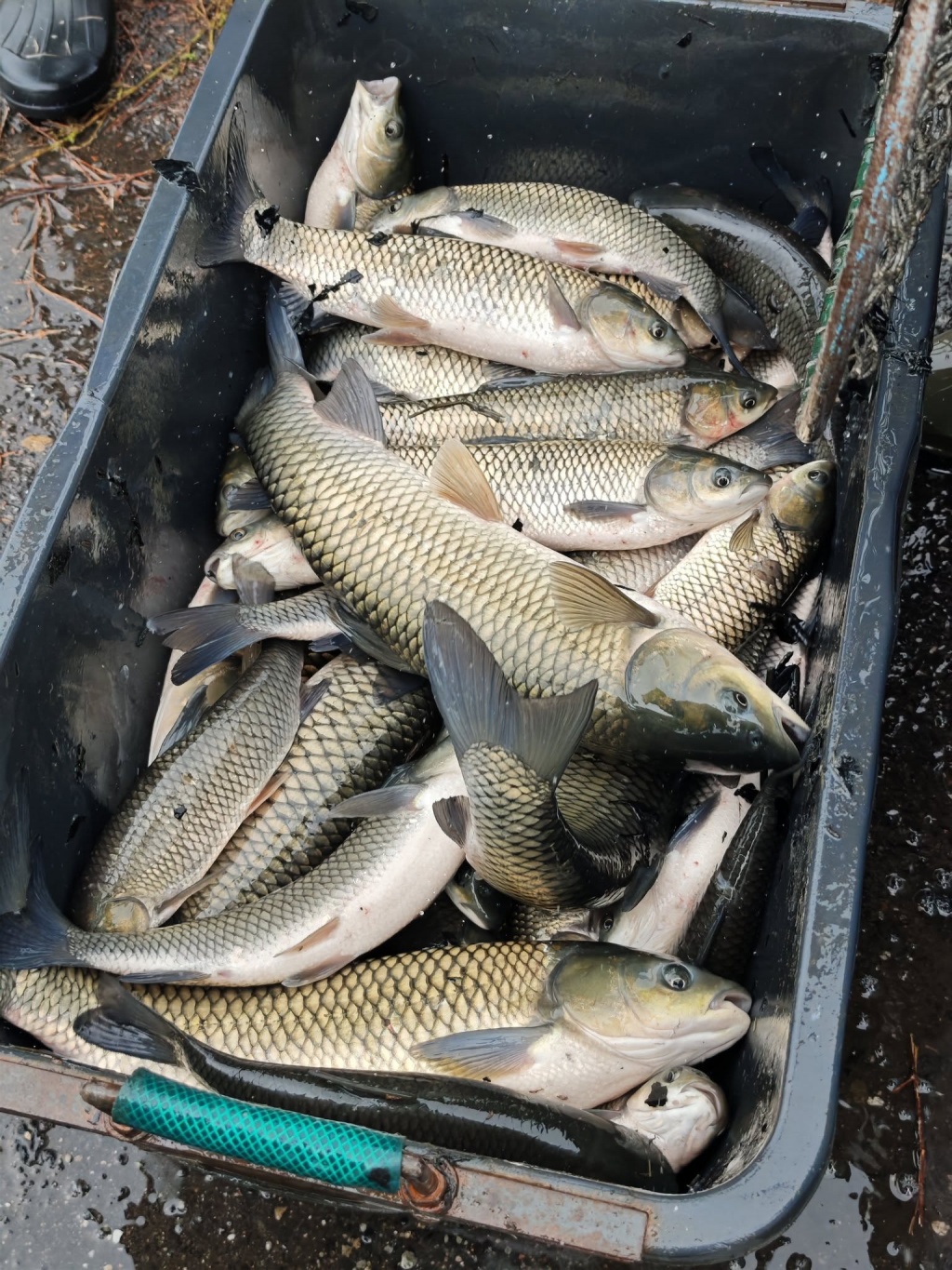 Včera byly na rybochovném zařízení Severočeského územního svazu v Chabařovicích sloveny první dvě chovné nádrže. Většina ryb určena do revírů, část k další produkci (chovu), to např. menší amuři.