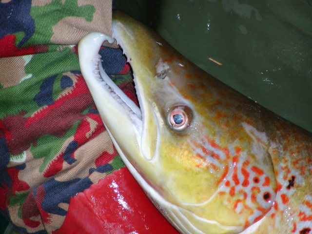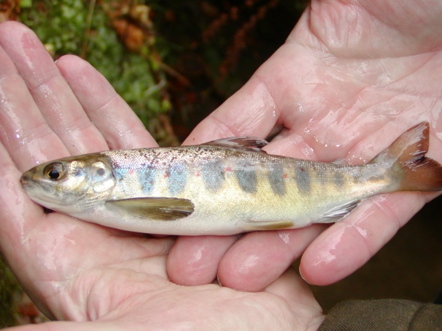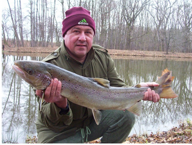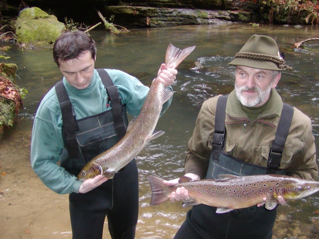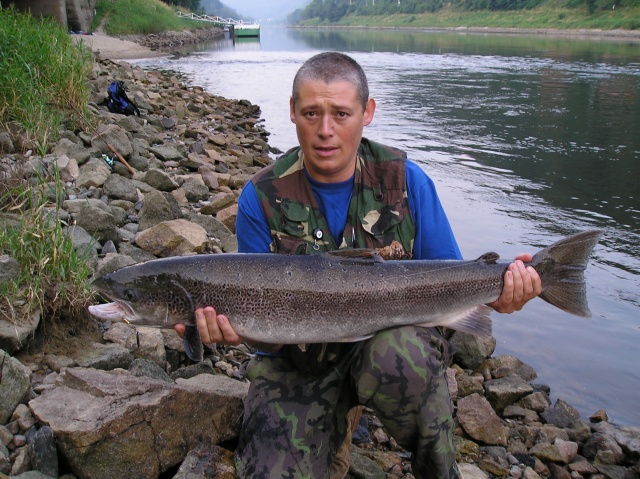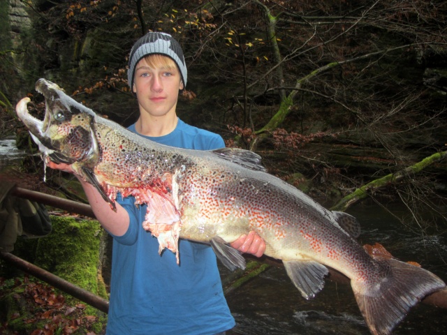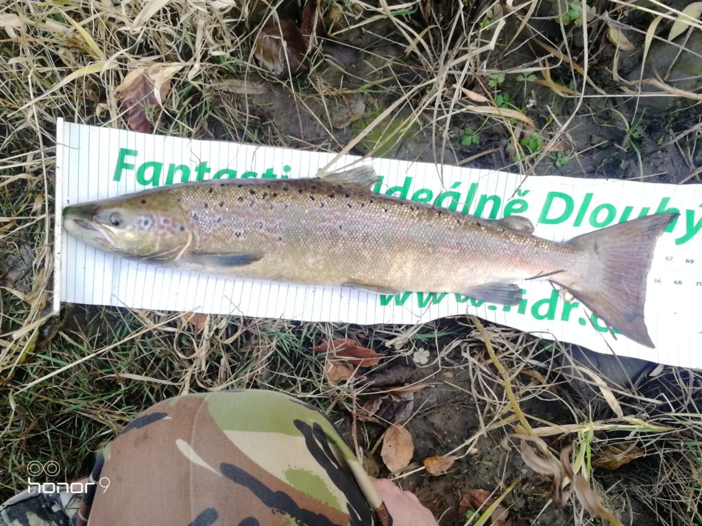 Údaje o lososech obecných ulovených při kontrolním odlovu 31. 10. 2002 na dolním toku Kamenice: samice 865 mm/ 3.750 g, samec 703 mm/ 2.400 g, samec 726 mm/ 3.150 g, samec 770 mm/ 3.450 g.